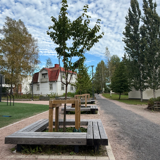 Keskellä olevat puut ovat vielä nuoria ja suojattu puisilla runkosuojilla, mutta ajan myötä ne kasvavat korkeiksi ja tuovat varjoa, tehden penkeistä entistä kutsuvampia oppilaiden ulkovälitunneilla.