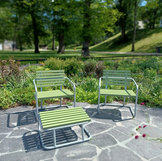 Kasvitieteellisen puutarhan edustalla voi nyt nauttia IISALMI-mallistomme aurinkotuoleista, nojatuoleista ja jakkaroista – maalattuina rauhallisen elegantilla vihreällä sävyllä, joka sulautuu harmonisesti ympäristöön ja jatkaa puiston aikaisempien kalusteiden teemaväriä. Vaikka kalusteilla on selkeän moderni ilme, niiden mittasuhteet ja materiaalit heijastavat keskuspuiston hillittyä arvokkuutta.